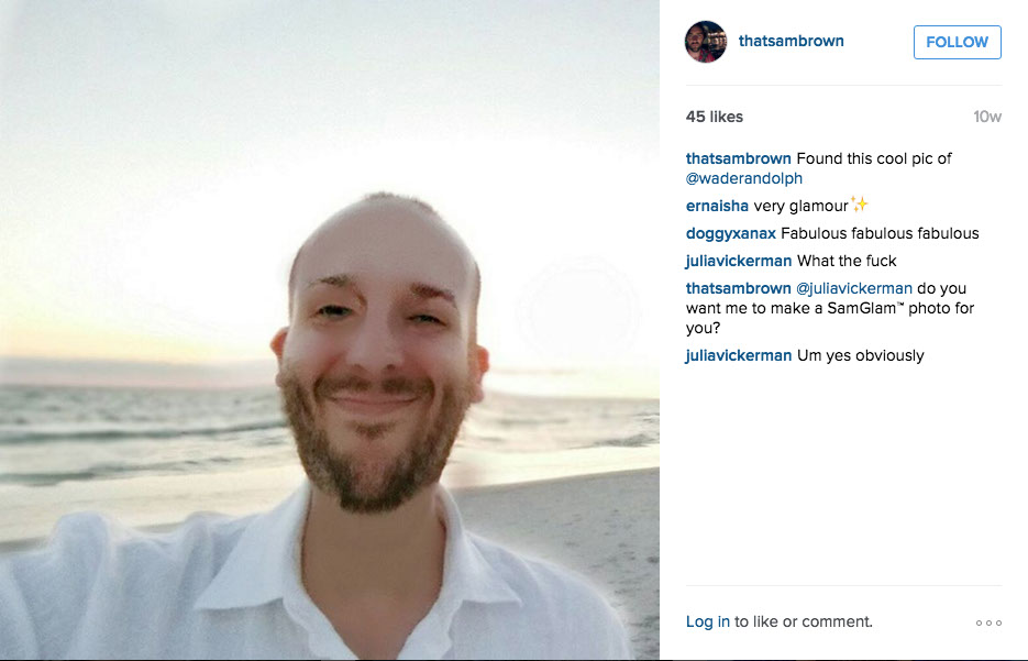10 WEEKS A GO - Sam's alters a photo of @Waderandolph. In a response to @juliavickerman's comment, Sam refers to this new art form as "SamGlam".
